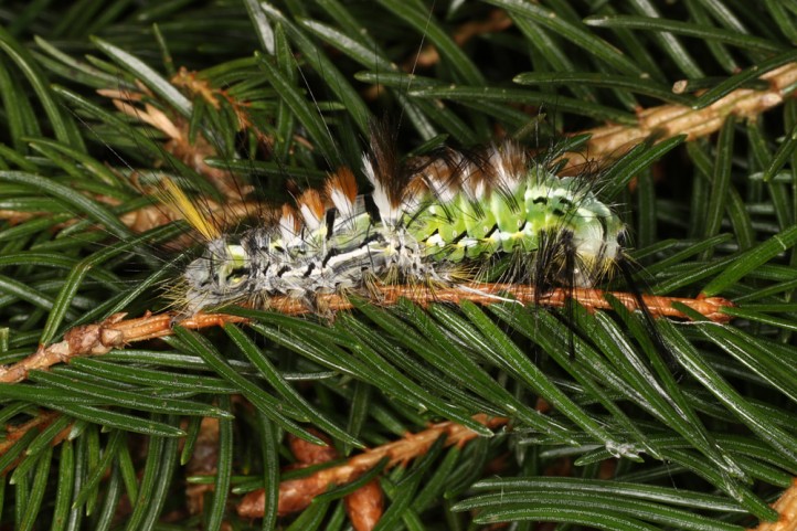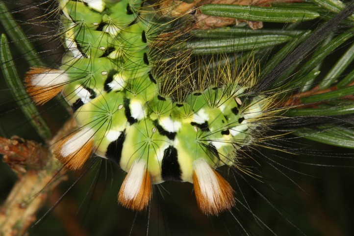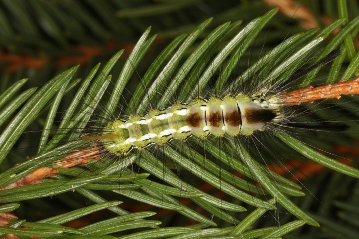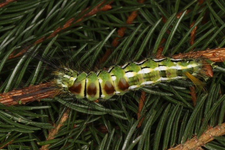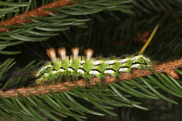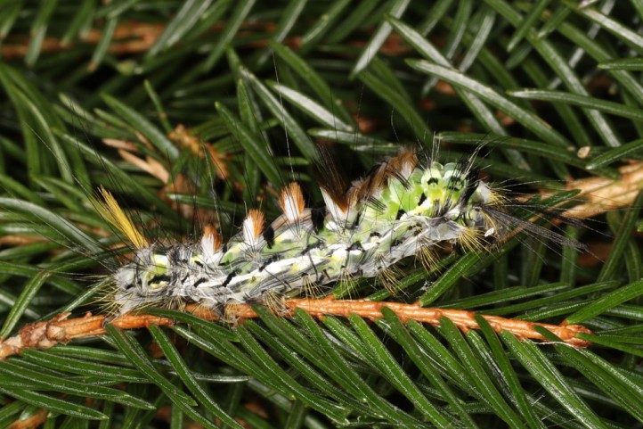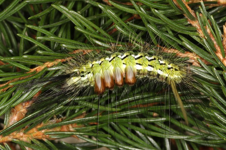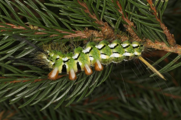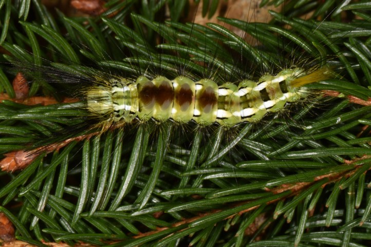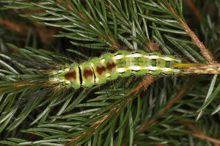 Calliteara abietis inhabits boreal coniferous forests, in central Europe usually in mountainous regions.