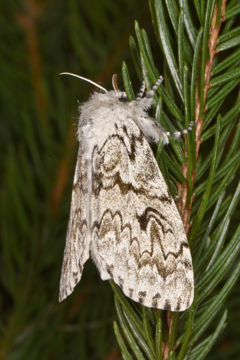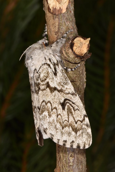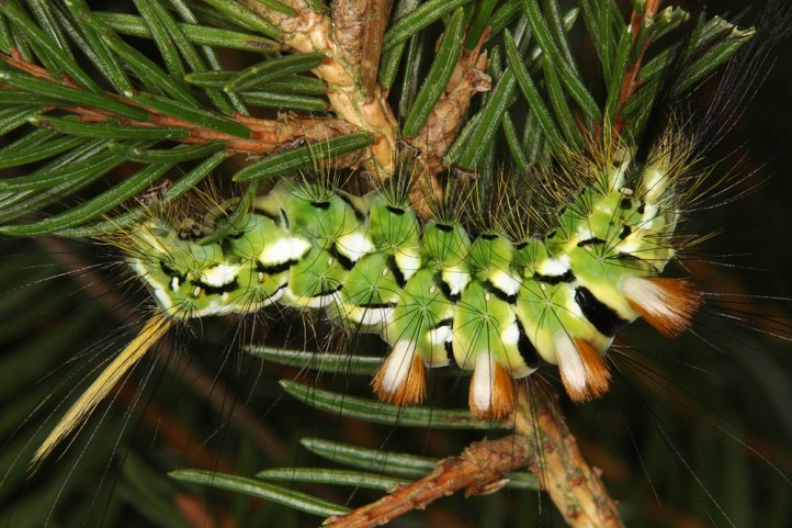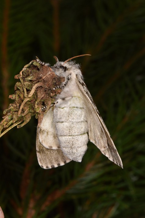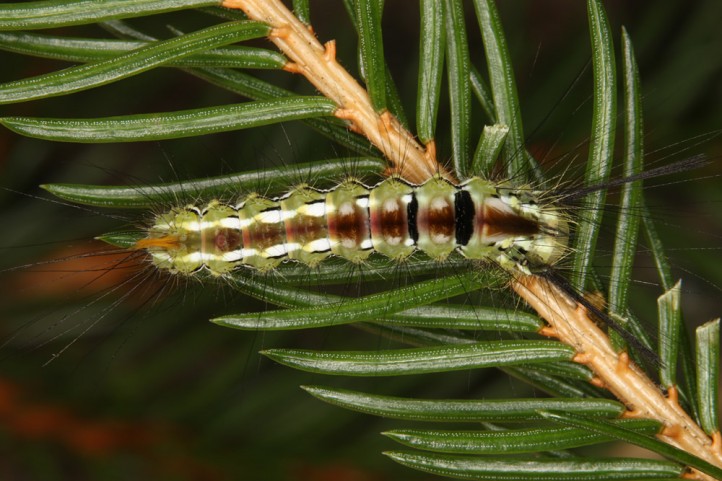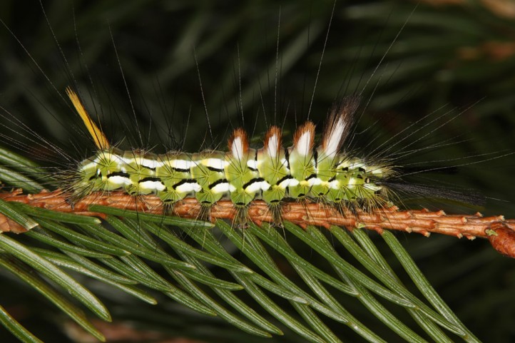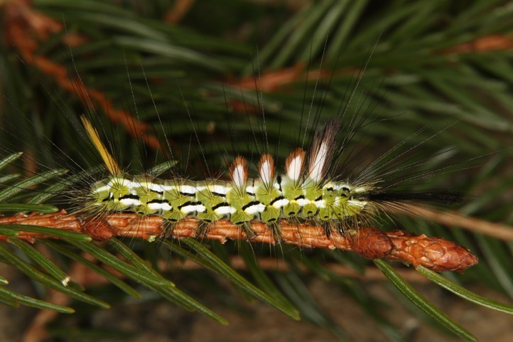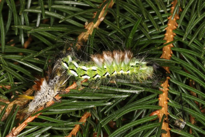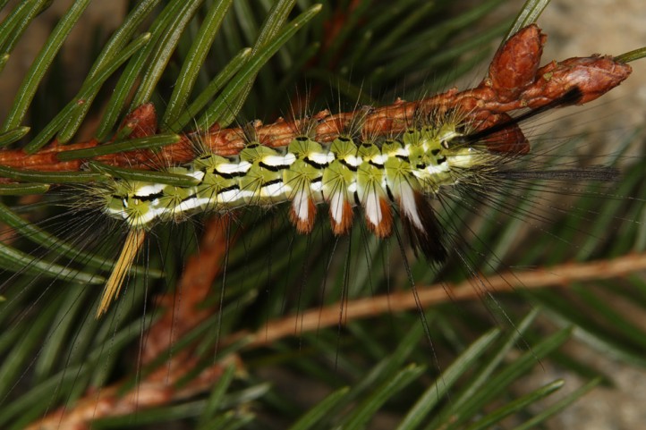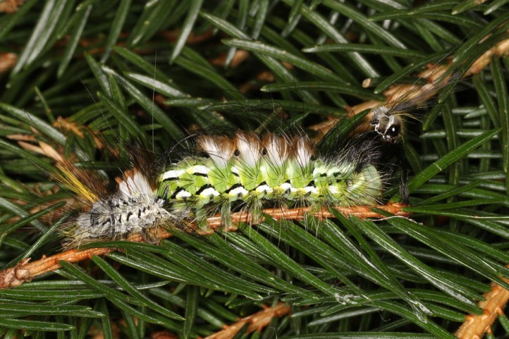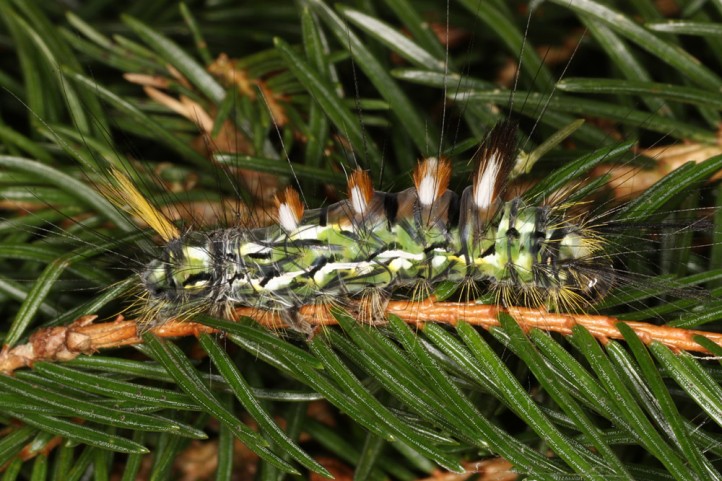 Calliteara abietis inhabits boreal coniferous forests, in central Europe usually in mountainous regions.