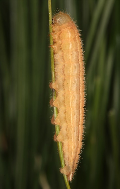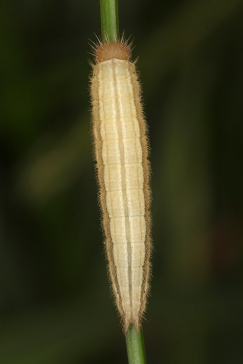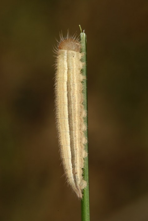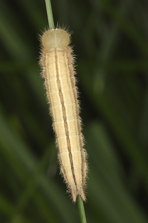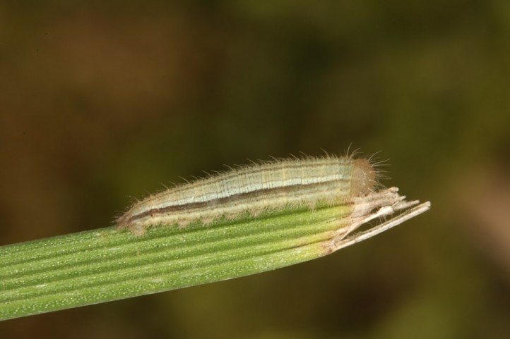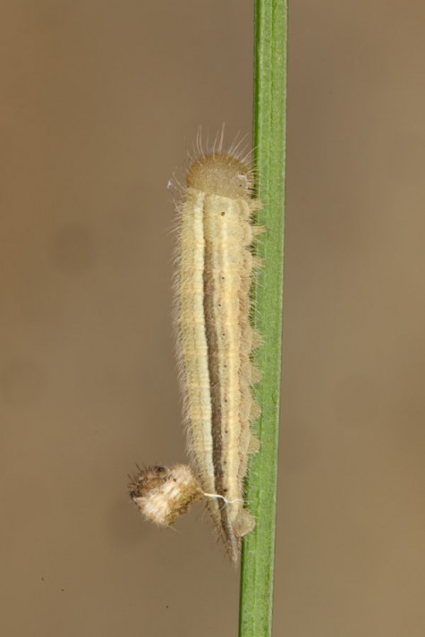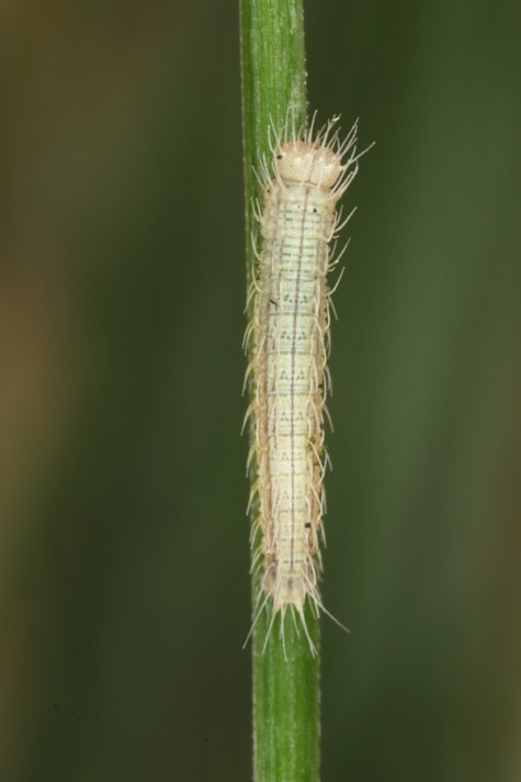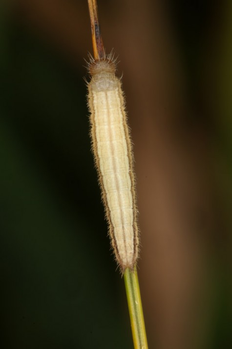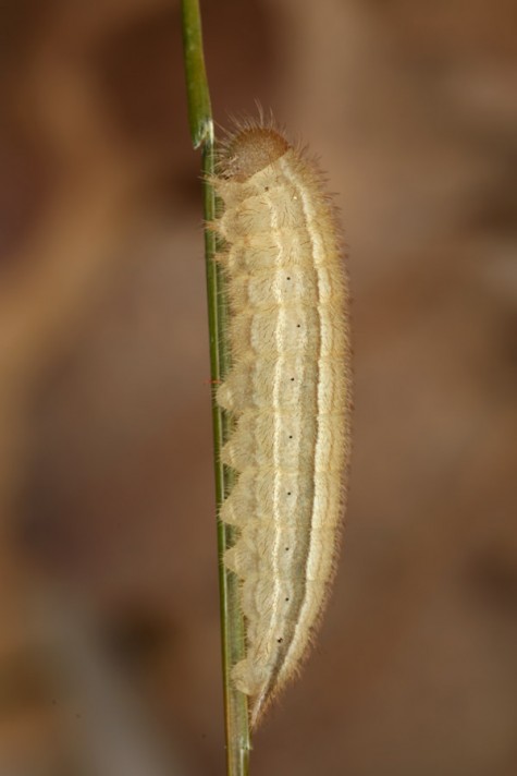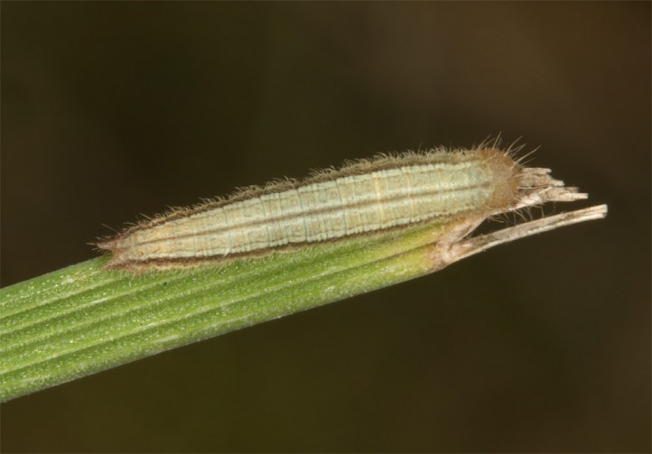 Die Falter fliegen im Frühjahr, je nach Höhenlage zwischen Mitte April und Juni. Die Eier werden bodennah an meist trockene Halme im Inneren der Grashorste abgelegt. Die geschlüpften L1-Raupen gehen dann ohne an Gras gefressen zu haben direkt in Diapause und entwickeln sich erst im Herbst nach den ersten Regenfällen, die zu austreibenden Grasblättern führen. Sie wachsen dann über den Winter heran (Hauptwachstum der letzten beiden Stadien ab Februar) und verpuppen sich Ende März oder im April nach 5 Raupenstadien in den Grashorsten.