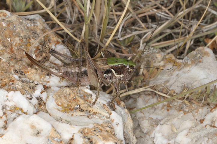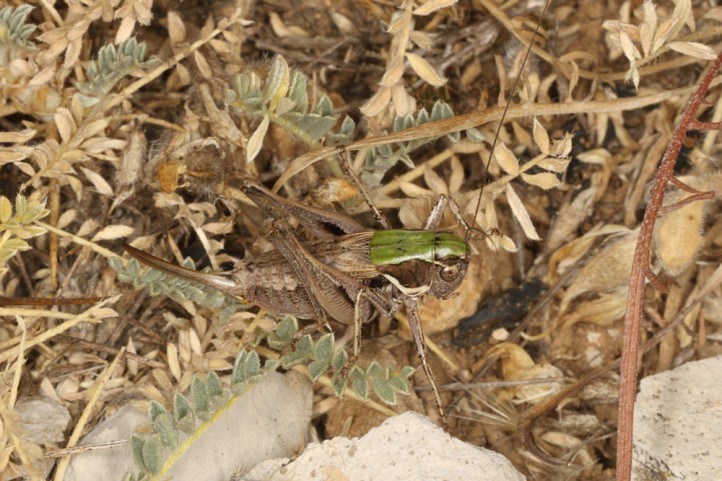 Die Imagines erscheinen von Ende Juni bis Oktober. Man kann sie durch Begehen aus den Zwegsträuchern aufscheuchen.