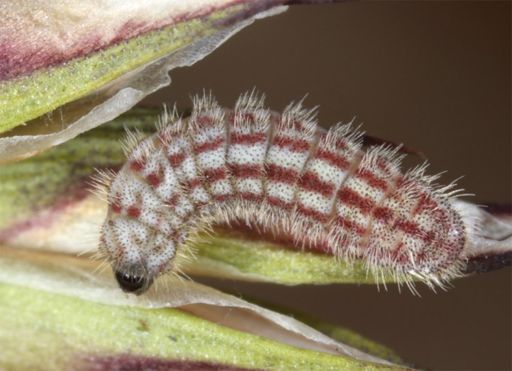 The pupa hibernates. The imagines fly in June and July with peak in late June. The eggs are deposited singly on still young flower shoots in wich the larvae live afterwards. They are well camouflaged and change sometimes the flower/fruits when fully consumed. Pupation should occur in the litter or at the base of the host plant (where there are always dead leaves).