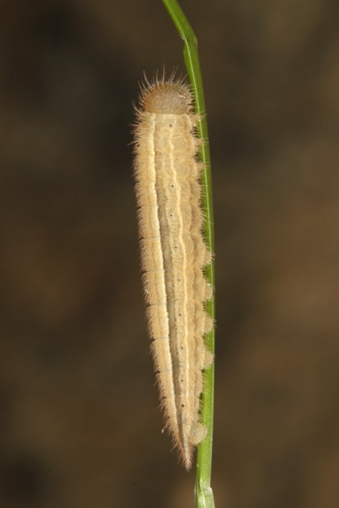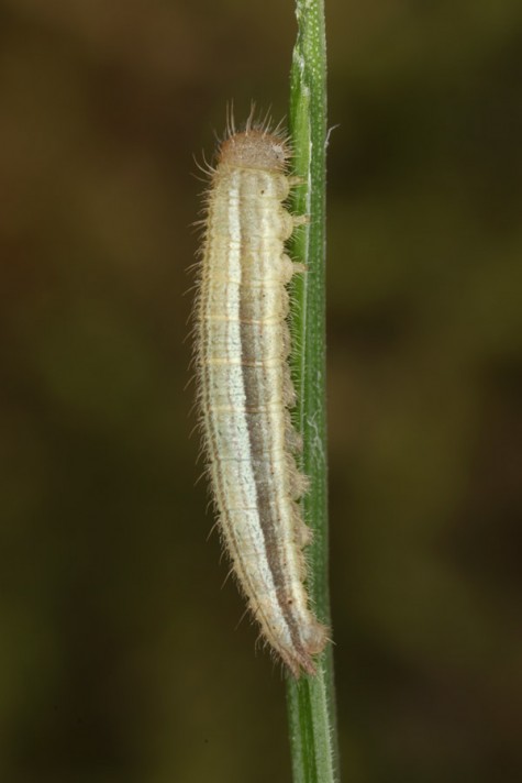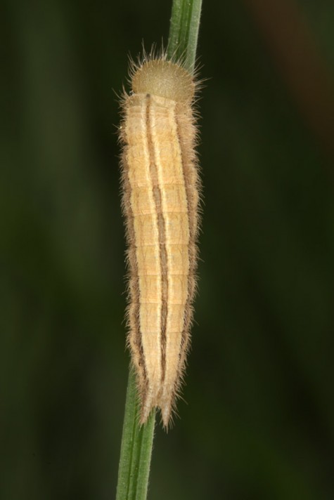 Die Falter fliegen im Frühjahr, je nach Höhenlage zwischen Mitte April und Juni. Die Eier werden bodennah an meist trockene Halme im Inneren der Grashorste abgelegt. Die geschlüpften L1-Raupen gehen dann ohne an Gras gefressen zu haben direkt in Diapause und entwickeln sich erst im Herbst nach den ersten Regenfällen, die zu austreibenden Grasblättern führen. Sie wachsen dann über den Winter heran (Hauptwachstum der letzten beiden Stadien ab Februar) und verpuppen sich Ende März oder im April nach 5 Raupenstadien in den Grashorsten.
